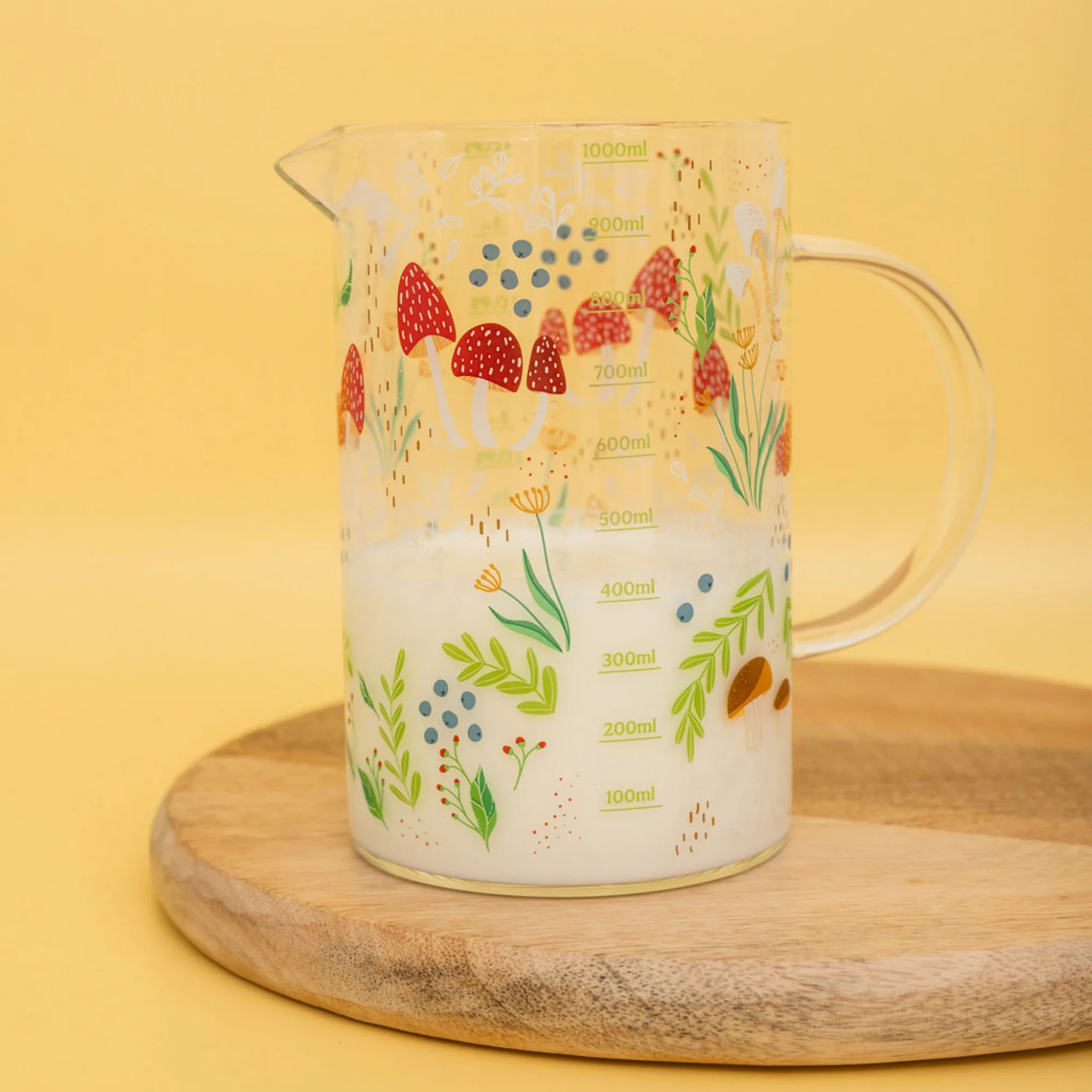 - Large 1000mL glass measuring cup with a whimsical mushroom design