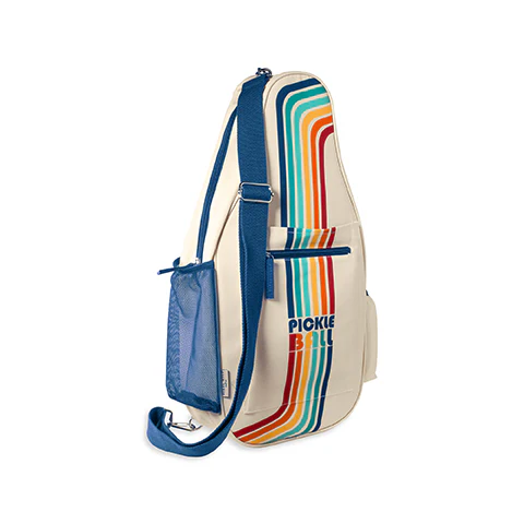 Say hello to your new favorite accessory. This Pickleball bag has tons of features that ensure all your accessories stay in one secure spot. The bag is sized to hold multiple paddles and is complete with a water bottle sleeve, a mesh pocket for balls, a zippered pocket for secure items, and more. Plus, it has a fence hook and an adjustable crossbody strap to keep it by you at all times. With a cool retro design printed on a sturdy canvas material, this sports bag is sure to step up your game off the court.