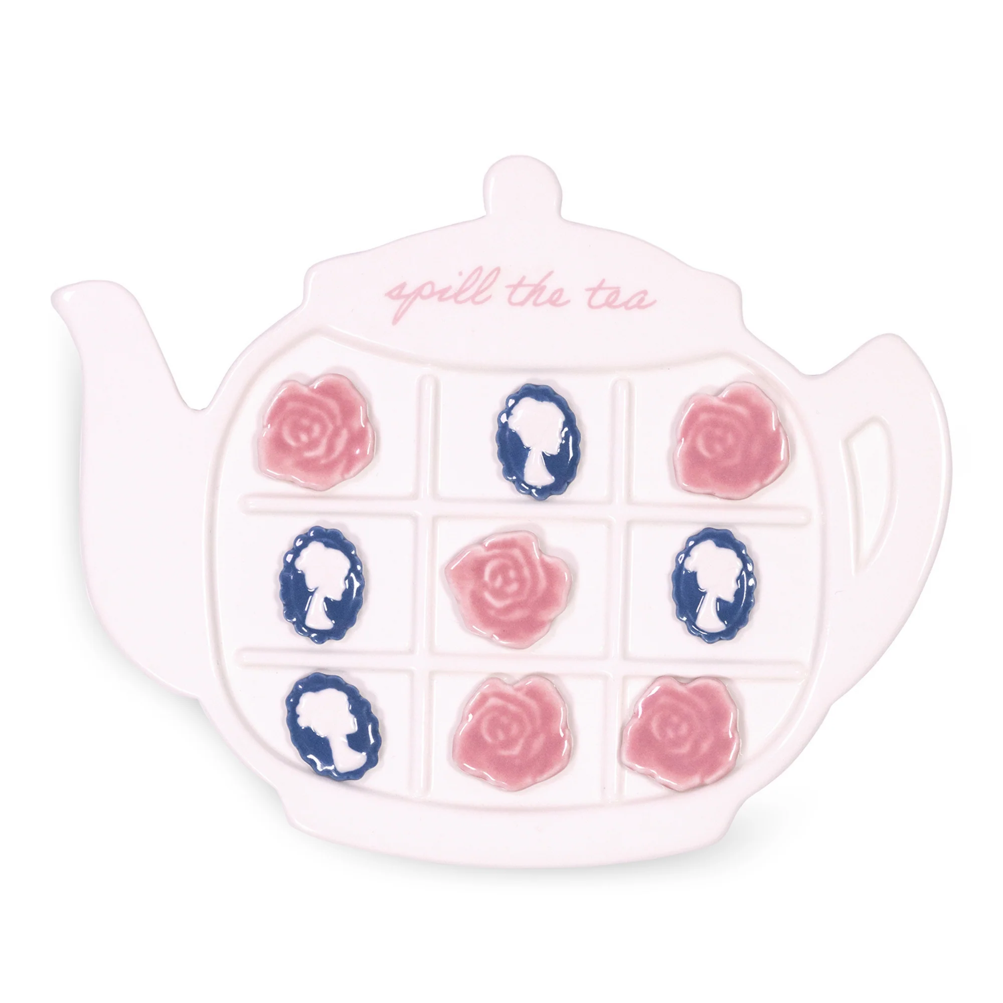 Brew up some fun with this teapot-shaped ceramic tic-tac-toe game! Featuring delicate rose and cameo pieces, itβs a charming twist on a classic game perfect for tea lovers and vintage souls alike. Whether set on your coffee table or featured in your game room, this tic-tac-toe set will make a statement.